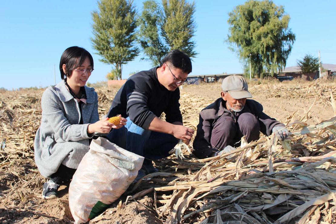 遼寧省錦州市食品藥品監管局科技信息與宣傳應急科科長、駐義縣頭道河鎮鄒家屯村第一書記兼駐村扶貧工作隊隊長劉玉磊(中)近日和扶貧干部范菲菲(左一)一起到農田幫村民收玉米,詳細了解農作物收成情況。孫淵 攝