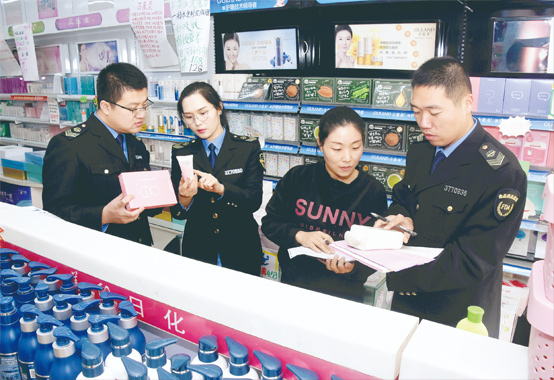 圖為12月10日該局執法人員在一家化妝品銷售門店開展檢查。 李慧 攝