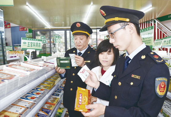 圖為執(zhí)法人員在一家藥品超市檢查。王雨林 邱海榮 攝影報(bào)道
