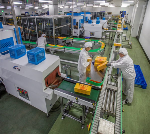 復方阿膠漿柔性生產線:復方阿膠漿柔性生產線打破傳統生產理念,2017年3月采用柔性輸送系統將燈檢、貼標、包裝、覆膜、裝箱碼垛進行優化集成。解決了輸送過程中的卡瓶、倒瓶等輸送技術難題,生產速度達每分鐘600支。該生產線班產50萬支,生產效率提高53%。同時采用預制成型的高端熱覆膜技術,提升了產品的美觀度。劉秋麗攝