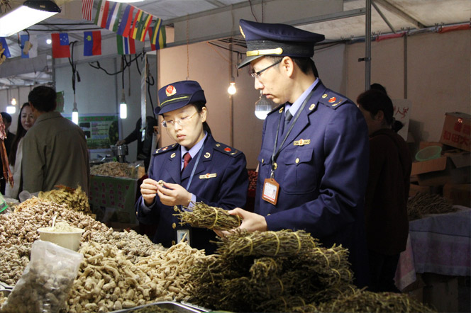 近日,浙江省象山縣市場監管局組織開展展銷會藥械監管專項行動,加強對參展中藥材及醫療器械的質量監管。圖為執法人員在展銷會一家攤位前檢查中藥材。姜琪妍 攝