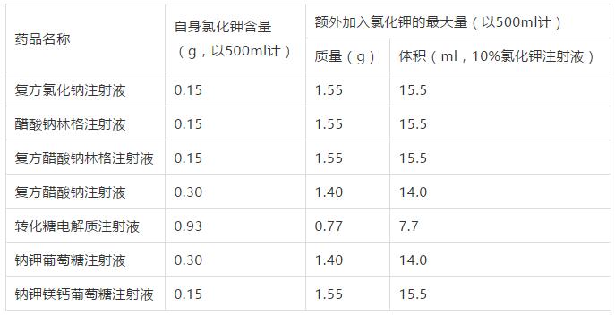 表2 臨床常見電解質類注射液及氯化鉀注射液額外可加入劑量