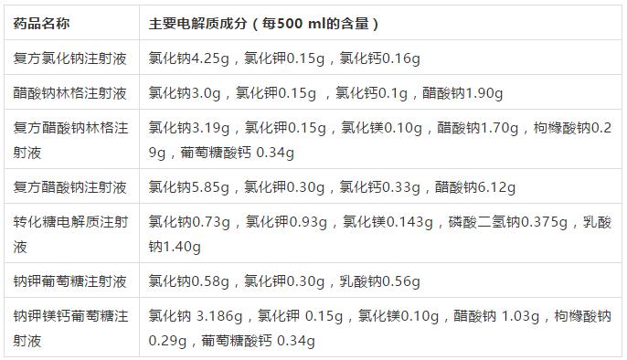 臨床常見的電解質類注射液及其成分見下表。
