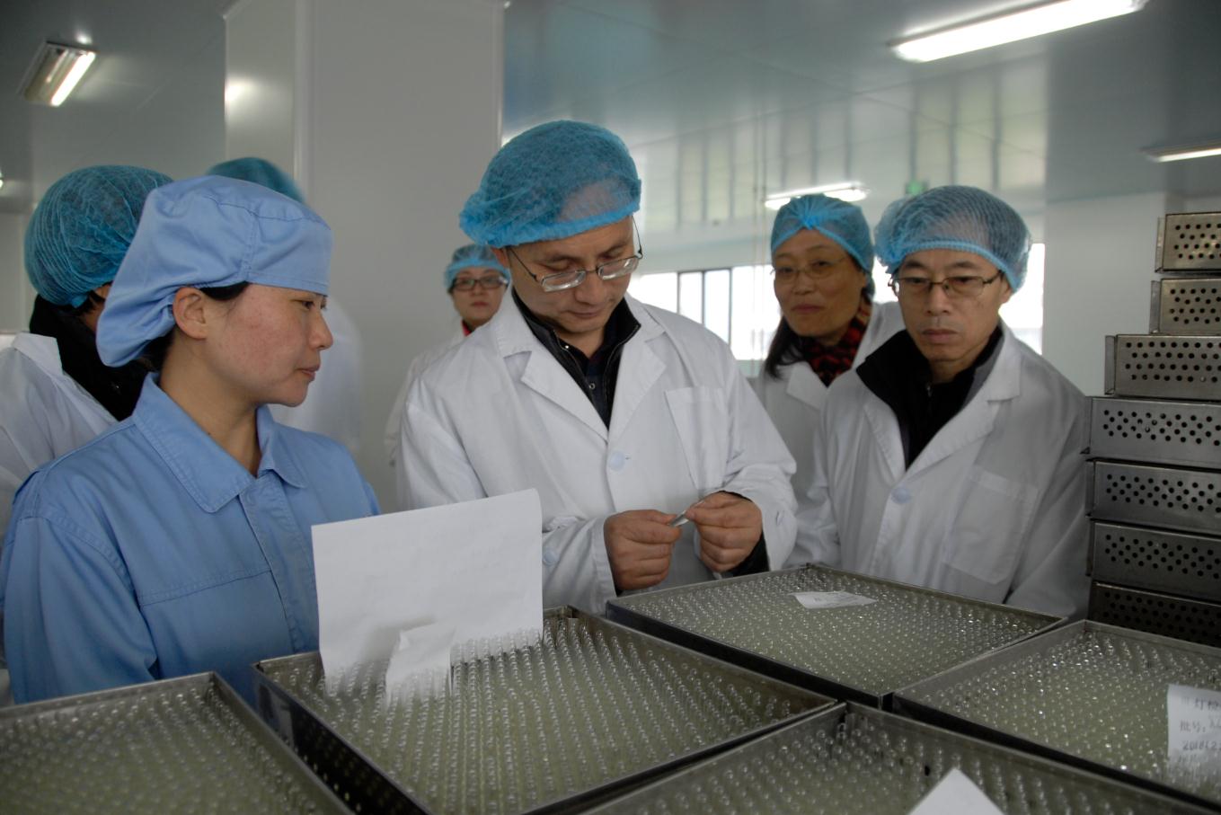 圖為劉本軍(右二)在口服車間藥品生產工藝。