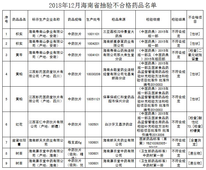 據(jù)了解,不合格藥品9批次中,3批次來自海南壽南山參業(yè)有限公司,2批次來自江西彭氏國藥堂飲片有限公司,2批次來自海南康農(nóng)堂中藥有限公司,江西百仁中藥飲片有限公司、海南新天夫藥業(yè)有限公司各占1批次。具體情況為: