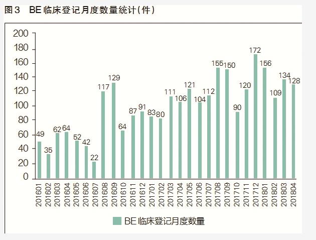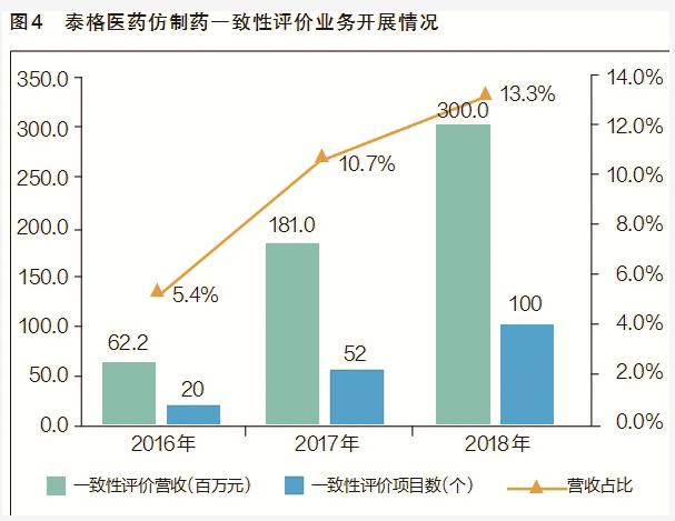 藥智網(wǎng)統(tǒng)計數(shù)據(jù)顯示,BE臨床新登記月度數(shù)量從2016年8月開始大幅增加,到2018年4月一直保持著較高的數(shù)量,這從側(cè)面反映出一致性評價工作正在加速(見圖3)。仿制藥一致性評價為CRO行業(yè)帶來了明顯的業(yè)務(wù)增量,以泰格醫(yī)藥為例,2016年,該公司仿制藥一致性評價收入約為6220萬元,僅占其營收總額的5%左右;2017年,來自仿制藥一致性評價的業(yè)務(wù)收入大幅提升到1.81億元,同比大增190%,營收占比提升到10.7%;2018年全年,預(yù)計該公司完成了約100個一致性評價項目,營業(yè)收入有望超過3億元(見圖4)。