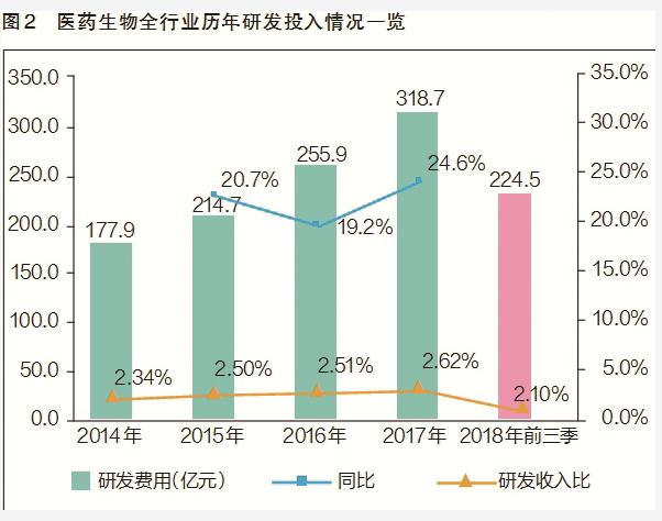 近年來,我國生物醫(yī)藥行業(yè)上市公司研發(fā)投入持續(xù)加大,不論是絕對數(shù)還是研發(fā)收入占比,都呈現(xiàn)出上漲趨勢。2015年,行業(yè)整體研發(fā)投入突破200億元大關(guān),達(dá)到214.7億元,同比增長20.7%,研發(fā)收入比為2.5%;2016~2017年,研發(fā)投入年增速高于營收增速,2017年研發(fā)投入突破300億元,研發(fā)收入比上升到2.62%;2018年前三季度,全行業(yè)研發(fā)投入總額達(dá)到224.5億元,研發(fā)收入比約為2.1%(見圖2)。研發(fā)投入的快速增長,直觀反映出企業(yè)研發(fā)需求的旺盛程度。
