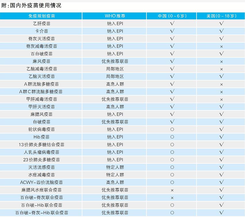 注:EPI(擴大免疫規(guī)劃);√:用于免疫規(guī)劃;×:未在本國內使用;○:作為非免疫規(guī)劃類疫苗在中國境內使用