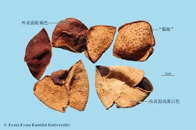陳皮:常剝成數瓣,基部相連,有的呈不規則的片狀,厚1~4mm。外表面橙紅色或紅棕色,有細皺紋和凹下的點狀油室;內表面淺黃白色,粗糙,附黃白色或黃棕色筋絡狀維管束。質稍硬而脆。氣香,味辛、苦。