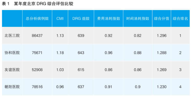 另外,DRG系統中的參數還可以用來橫向比較各個醫院的臨床治療綜合水平。如表1所示,北京協和醫院CMI和總DRG組數(即病例構成的寬度)均在所有參比醫院中處于領先地位,但在綜合參考費用和時間消耗因素上落后,綜合排名位列第二。DRG相關指標能將以前難以量化的醫療服務質量轉變為可量化的指標,使醫院和科室的雙橫向比較成為可能。而且醫院和科室之間科學量化的比較,能使優勢醫院和科室更透明,這將促進醫院科室之間對高新技術引進和應用的競爭。