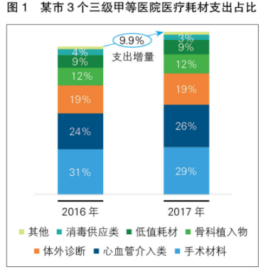 DRG的實施使藥品和醫療器械耗材從醫院的利潤中心轉變為成本中心,從收入來源轉變為控費目標。據相關研究表明,醫療耗材支出的增長幅度高于醫院收入的增長,這將導致醫院對耗材的控費更為緊迫。以圖1為例,可收費的醫療耗材的支出,如心血管介入類等占比一直在增加,而不可收費的醫療耗材,如部分手術材料、消毒供應類耗材的采購金額占比則呈明顯下降趨勢。