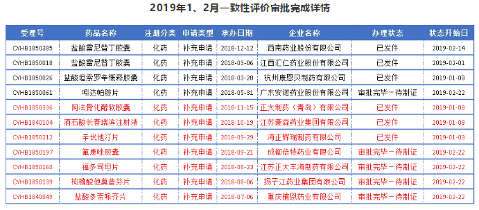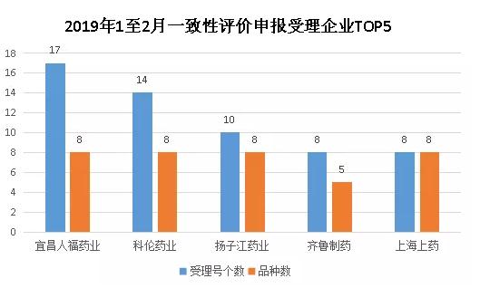 從企業角度來看,進入2019年各企業對于一致性評價激情也是大幅上漲,據藥智藥品注冊與受理數據庫統計,2019年1至2月,一致性評價申報獲受理數量最多的為宜昌人福藥業,有17個受理號8品種;其次是科倫藥業有14受理號8品種;揚子江、齊魯制藥和上海上藥緊隨其后。
