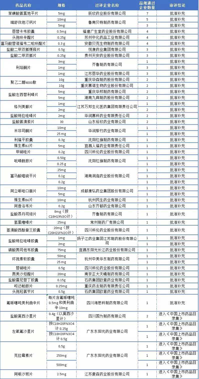 進入2019年以來一致性評價除了申報受理節奏明顯加快以外,審評審批效率也大有提升,2019年1月至今,共計新增54品規藥品通過一致性評價;其中苯磺酸氨氯地平片第7家過評企業產生,瑞舒伐他汀鈣平片過評企業達5家,恩替卡韋膠囊、頭孢呋辛酯片、富馬酸替諾福韋二吡呋酯片過評企業達4家,還有4品種3家滿員,6品種第2家過評,更是有26品種(36個規格)首家過評;此外,其中5個品種是通過進入《中國上市藥品目錄集》視同通過一致性評價,分別是國為制藥的鹽酸莫西沙星片、廣東東陽光的鹽酸莫西沙星片和左氧氟沙星片、江蘇豪森的阿哌沙班片。