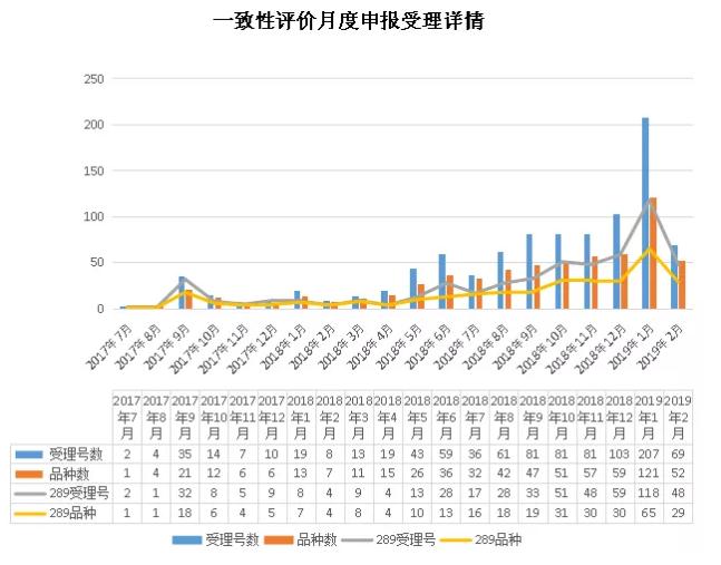 值得提及的是,2019年1月一致性評價申報受理號有207個,121個品種,環比2018年12月直接翻倍,其中289目錄品種占118個受理號,65個品種,同樣是2018年12月的2倍,再一次刷新記錄;2月因春節小長假,一致性評價有所放緩,但是截止25日,也有66個受理號49個品種申報獲受理,更多月度詳情可見下表。