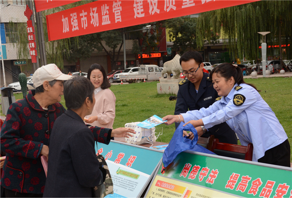 圖為甘肅省武山縣市場(chǎng)監(jiān)管局張瑜(右一)給群眾發(fā)放宣傳材料。丁怡媛 攝
