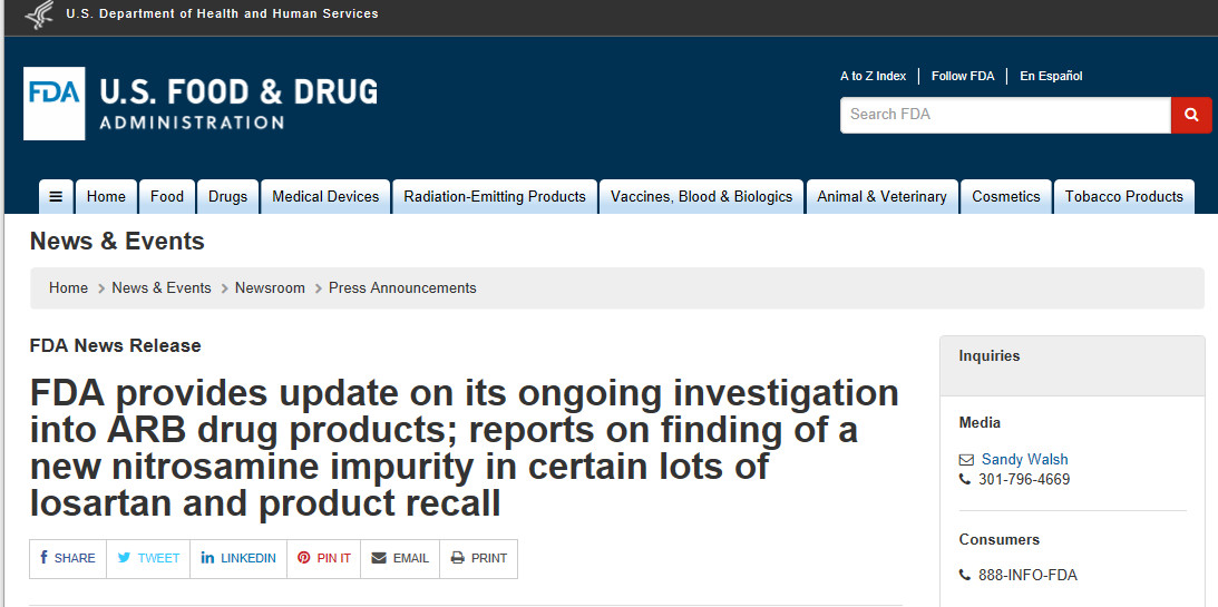 美國食品和藥物管理局(FDA)提醒從召回的地段服用ARB藥物的患者繼續(xù)服藥,直到他們的醫(yī)生或藥劑師提供替代或不同的治療方案。任何患者從一個(gè)尚未與他們的藥劑師或醫(yī)生交談的召回批次中服用ARB的患者應(yīng)該及時(shí)這樣做。并非所有ARB都含有亞硝胺雜質(zhì)。