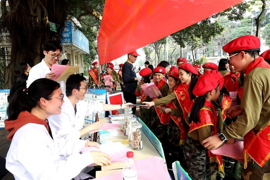 3月5日,廣西壯族自治區食品藥品檢驗所參加廣西南寧桃源北社區組織的2019年“學雷鋒 行善立德 志愿服務滿綠城”活動,用實際行動傳遞雷鋒精神正能量。圖為廣西食藥檢所專業技術人員向小學生志愿者們講解真假中藥材鑒別、科學用藥等知識。(陳淑賢 攝)