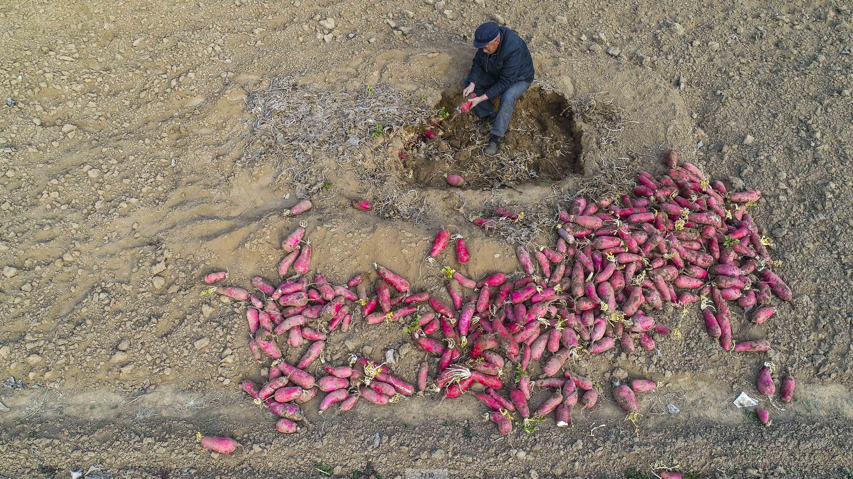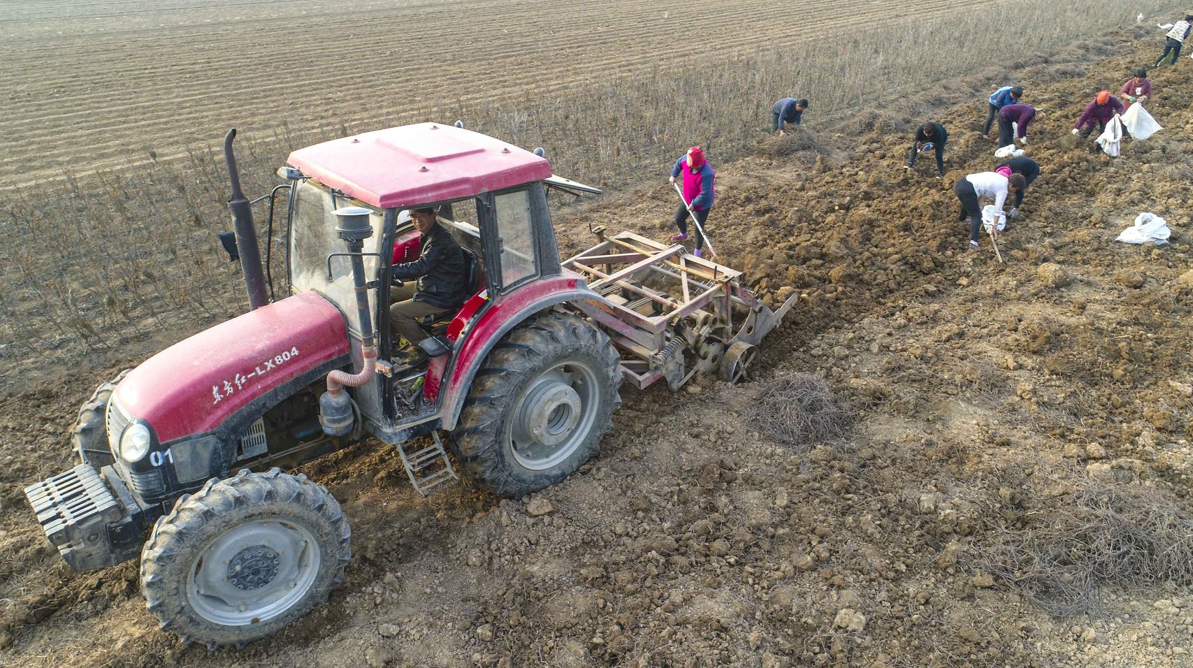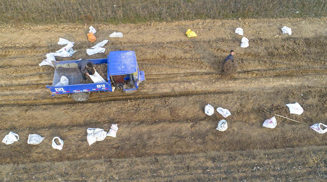 3月10日,在安徽省亳州市譙城區華佗鎮邢閣村,農民在收獲中藥材何首烏。劉勤利 攝(無人機航拍)