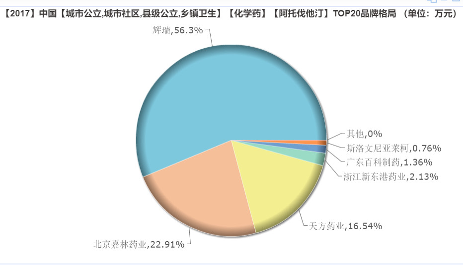 在2017年,阿托伐他汀鈣片市場份額前三名分別是輝瑞、北京嘉林和天方藥業(yè);其中,輝瑞占56.3%,北京嘉林和天方藥業(yè)分別為22.91%和16.54%。