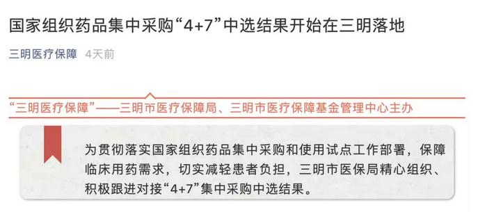 近日,三明市醫(yī)療保障管理局、市醫(yī)療保障基金管理中心主辦的公眾號“三明醫(yī)療保障”發(fā)布消息:國家組織藥品集中采購“4+7”中選結(jié)果開始在三明落地。