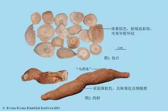 性狀鑒別:本品多呈紡錘狀,略彎曲,有的中部收縮成連珠狀,長6~15cm,直徑1~3cm。表面黃棕色或黃褐色,有縱皺紋及稀疏的細根痕。質堅硬。切片厚0.2~2mm,切面黃白色或淡黃棕色,射線放射狀,可見年輪環紋,中心顏色較深。氣香,味微苦、辛,有清涼感。