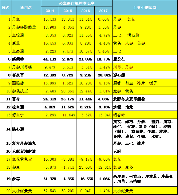 如表3,在國內公立醫療機構銷量前20位品種中,描黃色的是已被納入輔助用藥并重點監控的品種,基本都是在醫療機構銷售占比過高的中藥注射劑。被重點監控后,其臨床銷售量預計會出現較大幅度下滑,從而影響到丹參、紅花、三七、人參等熱點中藥材的需求量。