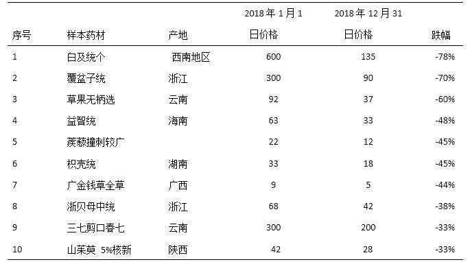 表2 2018年中藥材價格綜合200指數構成品種跌幅前10位(中藥材天地網)