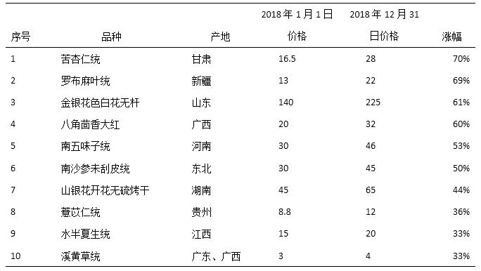 表1 2018年中藥材價格綜合200指數構成品種漲幅前10位(中藥材天地網)