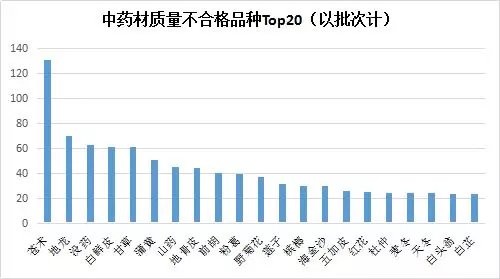 圖14 2018年,抽檢中藥材質量不合格品種前20位(根據國家藥監局發布數據整理)