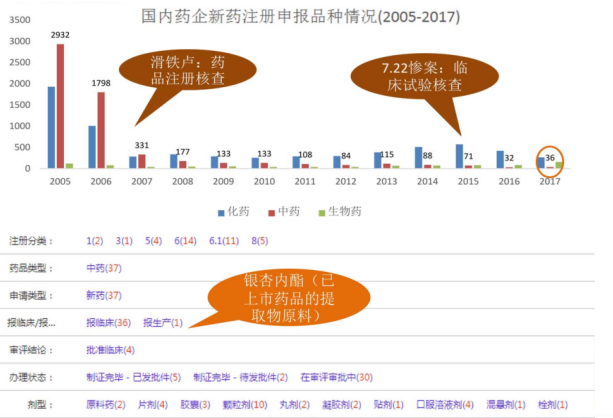 圖15 2005-2017年,國內新藥注冊申報情況統計(根據原國家食藥監總局發布數據整理)