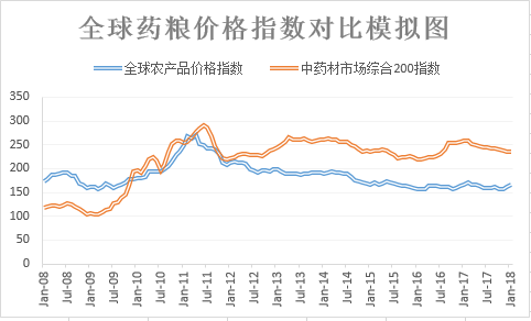 我們通過多項指數模擬,發現反映國內中藥材市場行情運行的中藥材天地網綜合200指數(以下簡稱綜合200指數)運行,與全球糧價緊密關聯。通過等比例縮放,二者保持錯峰相關性,即藥材價格下行,多在糧價下行半年后發生。原因是在藥糧比作用下,糧價過低會刺激各地加強藥材種植積極性,從而導致藥材跌價;反之亦然。