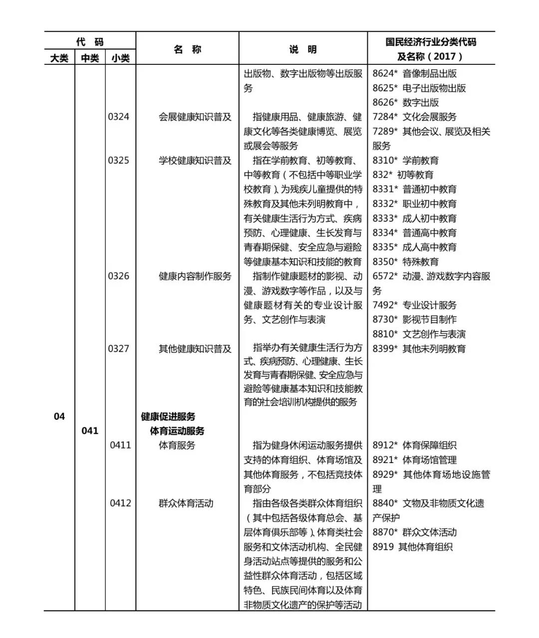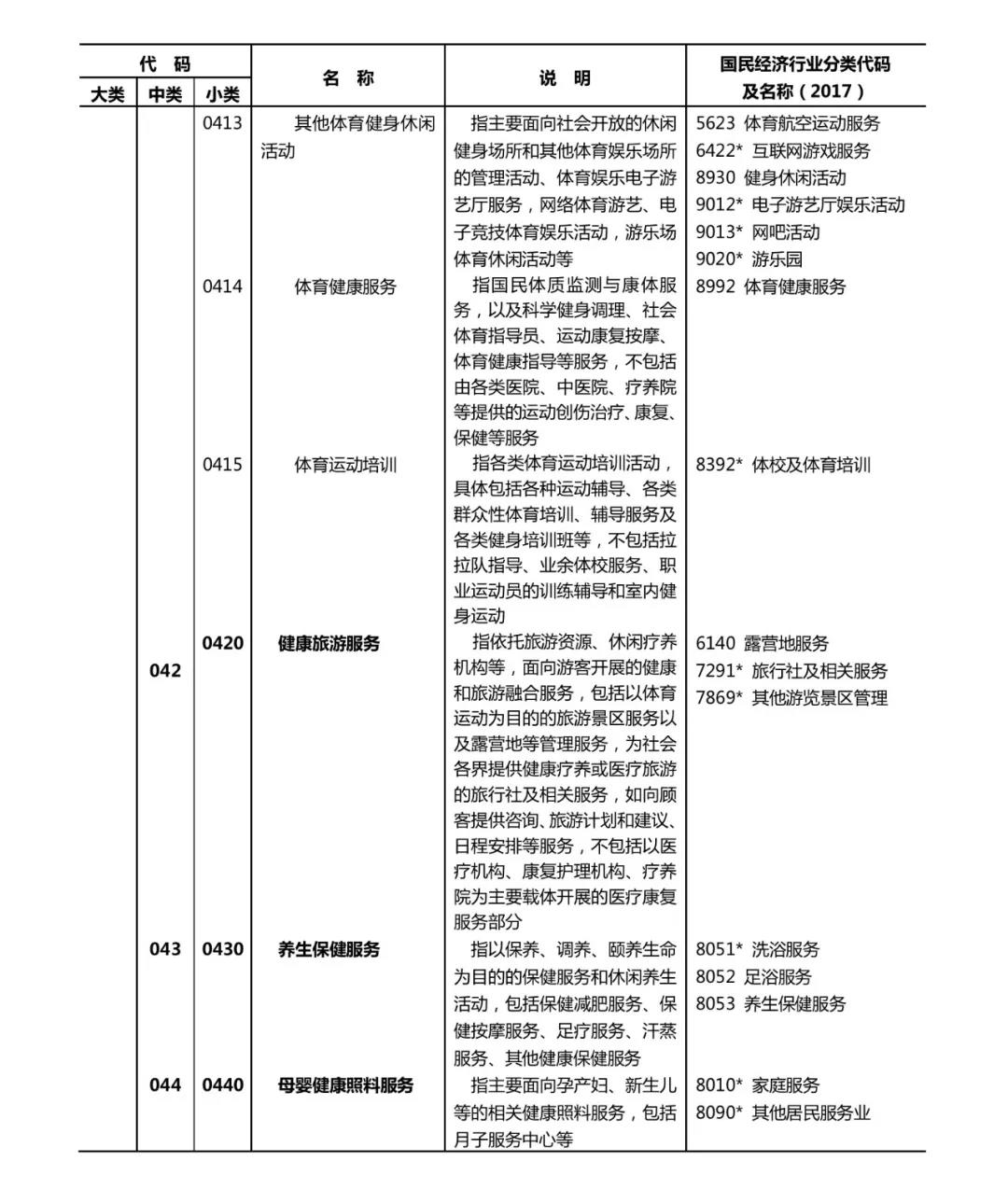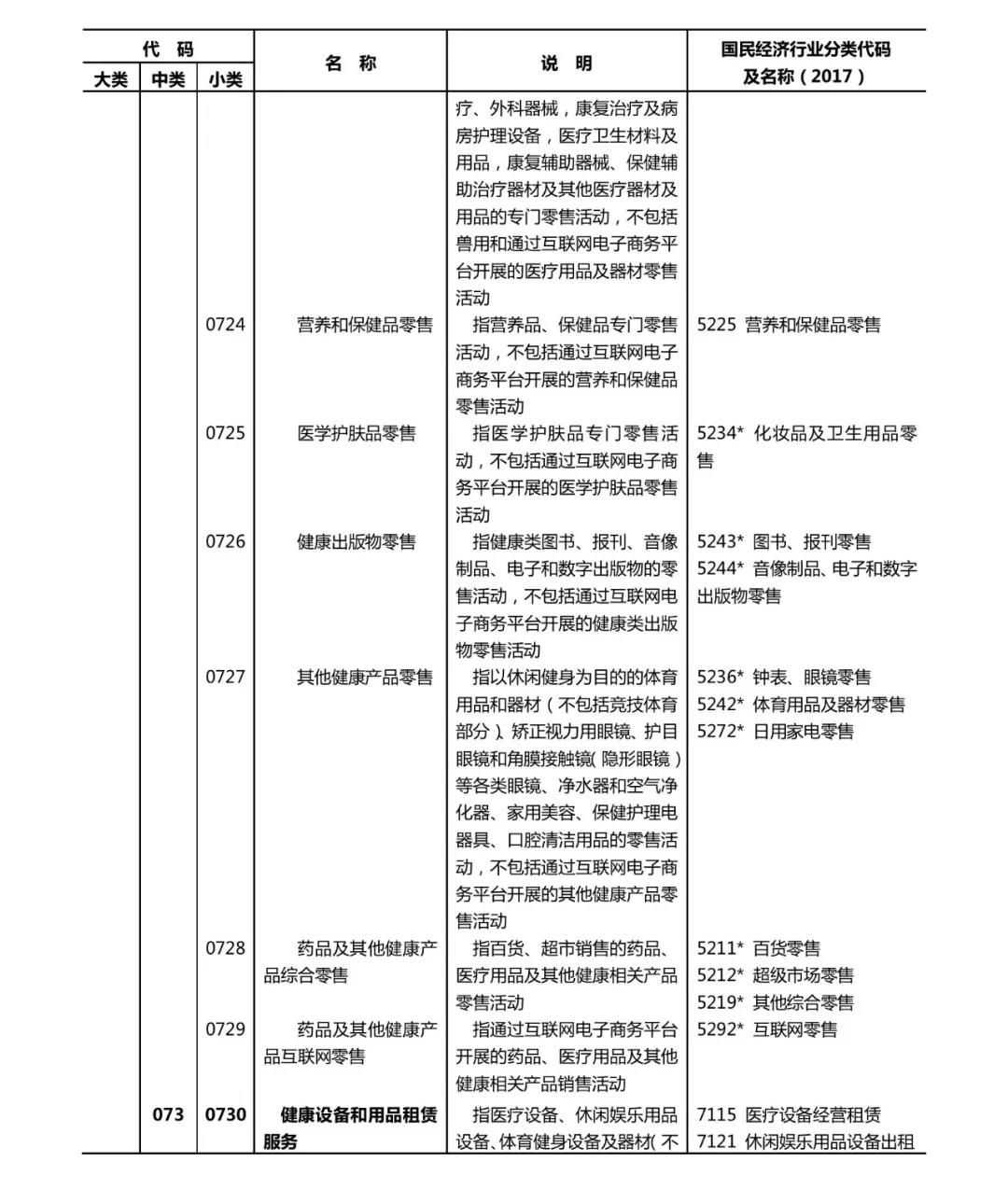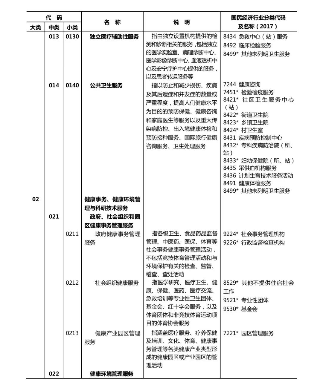 (一)本分類建立了與《國民經濟行業分類》(GB/T 4754-2017)的對應關系。在國民經濟行業分類中僅部分活動屬于健康產業的,行業代碼用“*”做標記。