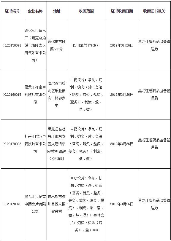 黑龍江省藥監局收回4家企業藥品GMP證書