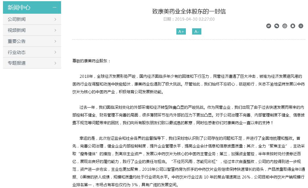 4月30日凌晨2:27,康美藥業官網發布董事長馬興田署名的《致康美藥業全體股東的一封信》稱,“作為民營企業,我們出現了由于過去快速發展而帶來的內部控制不健全、財務管理不完善的局面,很多薄弱環節在內外部的壓力下更加凸顯”,并“對于公司治理不完善、內部管理制度不健全、信息披露不規范等問題帶來的困擾”,向所有股東致歉。