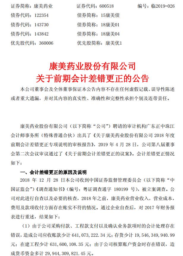 4月30日,康美藥業發布《康美藥業股份有限公司關于前期會計差錯更正的公告》(以下簡稱“差錯更正公告”),更正其2017年財報中出現的會計差錯。據這份公告,由于公司核算賬戶資金時存在錯誤,造成貨幣資金多計29944309821.45元。