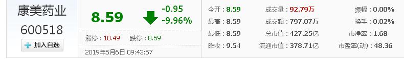 5月6日9:30。康美藥業股票開盤報8.59元,股價下跌9.96%,封上跌停板。