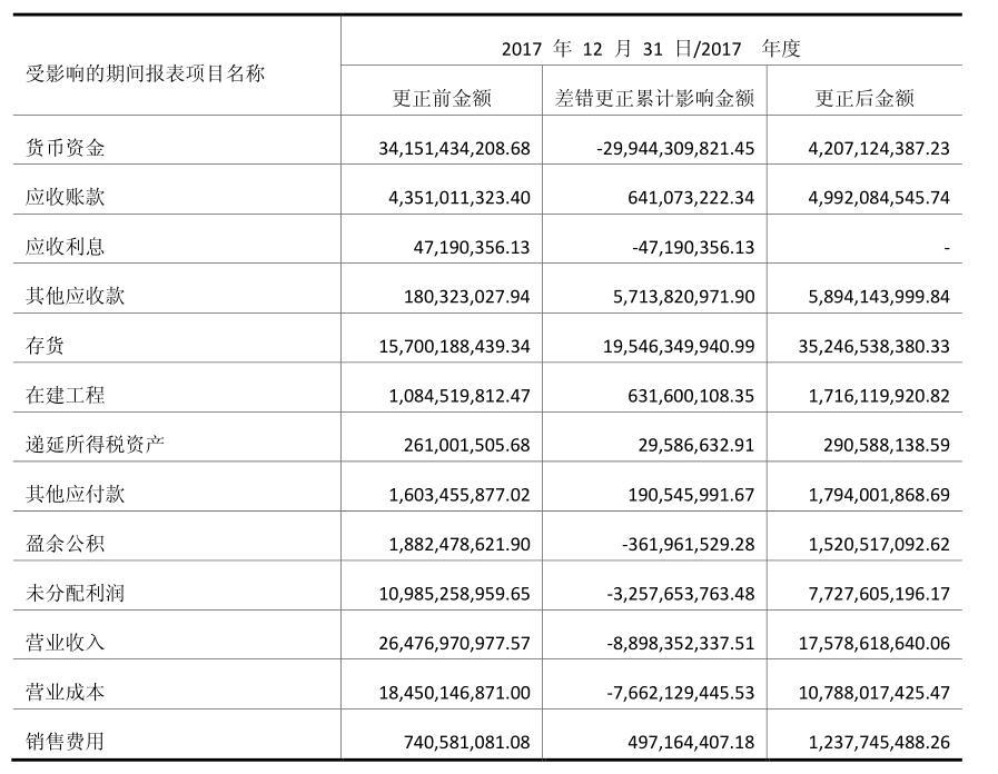 企業自查后對2017年度財務報表進行重述,分別調減貨幣資金299.44億元、營業收入88.98億元、營業成本76.62億元等,調增存貨為195.46億元、其他應收款57.14億元、應收賬款6.41億元、在建工程金額6.32億元等。