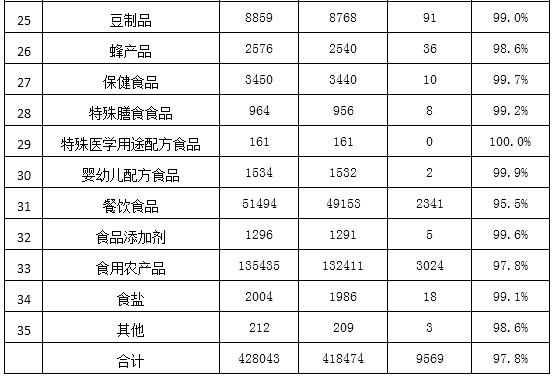 通告指出,2019年第一季度,全國市場監管系統共完成并公布428043批次食品(含保健食品和食品添加劑)樣品監督抽檢結果,檢驗項目全部合格的418474批次,不合格的9569批次,總體不合格率為2.2%,比2018年同期下降0.4個百分點。大宗食品合格率保持基本穩定,其中5類食品(糧食加工品,肉制品,蛋制品,乳制品,食用油、油脂及其制品)合格率分別為99.0%、98.4%、99.9%、99.9%、98.6%,均高于總體合格率。
