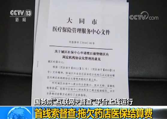 國務(wù)院 “互聯(lián)網(wǎng)+督查” 平臺(tái)日前上線運(yùn)行。上線首日,平臺(tái)收到了第一條問題線索,群眾反映:山西省大同市市區(qū)兩級(jí)醫(yī)保機(jī)構(gòu)互相推諉,拖欠醫(yī)保定點(diǎn)零售藥店結(jié)算費(fèi)用,導(dǎo)致該市平城區(qū)100多家藥店流動(dòng)資金枯竭,面臨倒閉。記者隨同國辦督查室工作人員,趕赴山西省大同市調(diào)查。