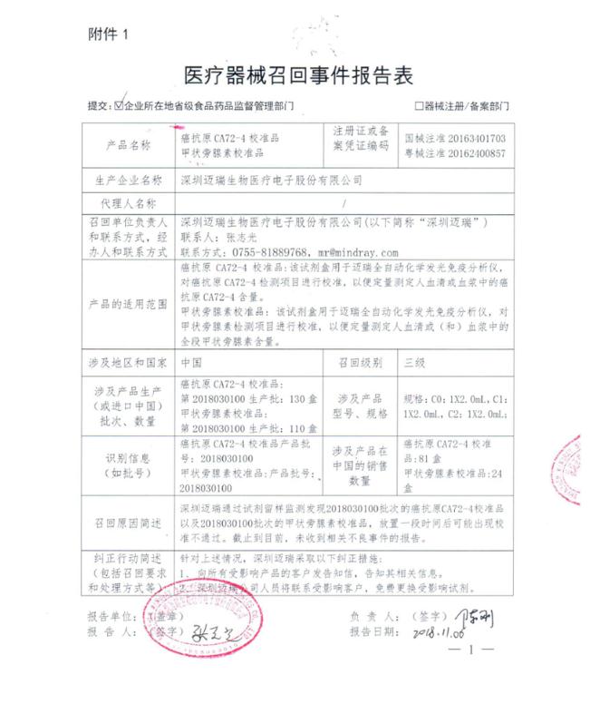 2018年11月16日,國家藥監局發布《深圳邁瑞生物醫療電子股份有限公司對癌抗原CA72-4校準品、甲狀旁腺素校準品主動召回》信息(鏈接為http://www.nmpa.gov.cn/WS04/CL2135/332282.html)——“深圳邁瑞生物醫療電子股份有限公司報告,由于放置一段時間后可能出現校準通不過,深圳邁瑞生物醫療電子股份有限公司對其生產的癌抗原CA72-4校準品(注冊號:國械注準20163401703)、甲狀旁腺素校準品(注冊號:粵械注準20162400857)主動召回。召回級別為三級。涉及產品的型號、規格及批次等詳細信息見《醫療器械召回事件報告表》。”