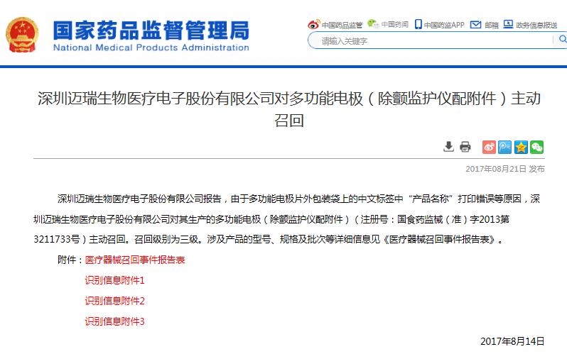 2017年8月21日,國家藥品監管部門官網發布《深圳邁瑞生物醫療電子股份有限公司對多功能電極(除顫監護儀配附件)主動召回》信息(信息鏈接為http://www.nmpa.gov.cn/WS04/CL2135/321102.html),“深圳邁瑞生物醫療電子股份有限公司報告,由于多功能電極片外包裝袋上的中文標簽中“產品名稱”打印錯誤等原因,深圳邁瑞生物醫療電子股份有限公司對其生產的多功能電極(除顫監護儀配附件)(注冊號:國食藥監械(準)字2013第3211733號)主動召回,召回級別三級。”