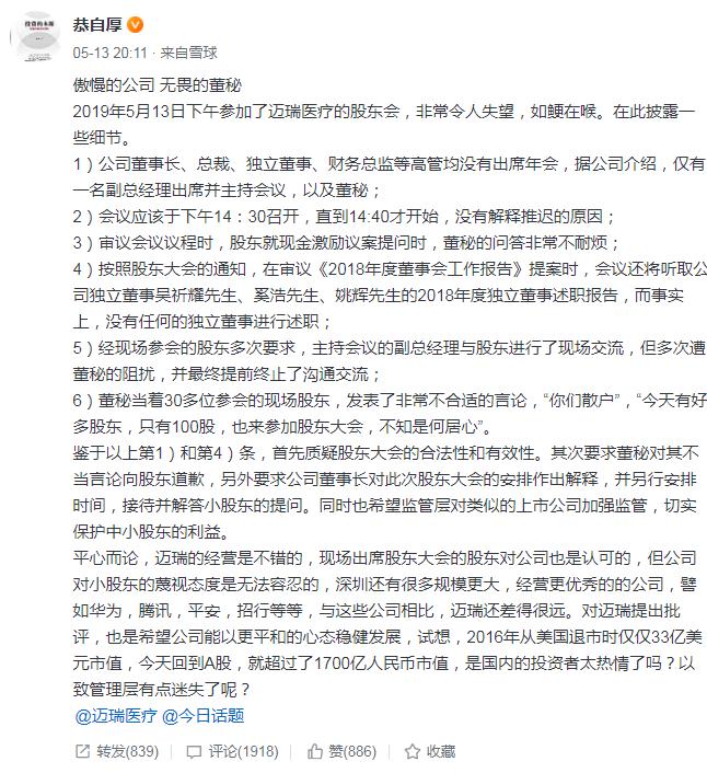中國食品藥品網訊(記者 蔣紅瑜) 5月13日晚間有投資者在雪球網站發帖表示,當天下午參加了深圳邁瑞生物醫療電子股份有限公司(以下簡稱“邁瑞醫療”)的股東大會,非常令人失望。該投資者稱,董秘當著30多位參會股東的面,發表了非常不合適的言論,“你們散戶”“今天有好多股東,只有100股,也來參加股東大會,不知是何居心”。