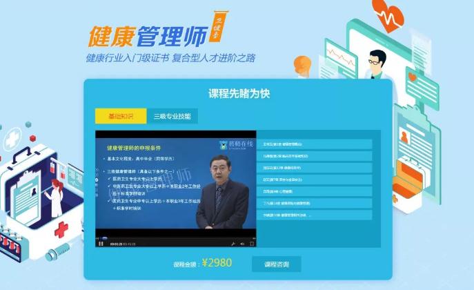 健康管理師是從事對人群或個人健康和疾病的監測、分析、評估以及健康維護和健康促進的專業人員。“藥師在線”相關負責人介紹,“健康管理師”學習平臺擁有權威師資,課程配套2019版教材,緊跟考試大綱,可實現實時答疑、離線學習。培訓課程涵蓋臨床醫學、預防醫學、康復醫學、慢病管理、心理學、運動學、中醫學、營養學等基礎內容,以及健康監測、健康風險評估、健康指導、健康危險因素干預等專業知識,適合零基礎、相關專業但自主學習性弱以及想系統學習提升職業技能的學員。