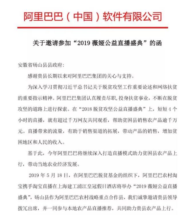 5月18日,在阿里巴巴脫貧基金會組織下,阿里巴巴農村淘寶攜手淘寶直播在上海舉辦“2019 薇婭公益直播盛典”,通過直播模式助力縣域農產品上行,帶動當地鄉村振興發展。碭山縣作為阿里巴巴農村戰略重點合作縣應邀參加。