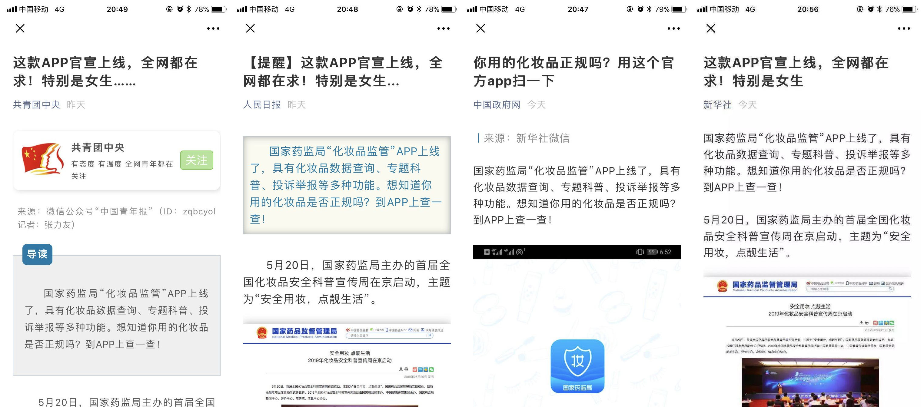 “這款APP官宣上線,全網都在求!特別是女生……”5月21日,化妝品監管APP先后登上共青團中央和人民日報的微博、微信公眾號,5月22日中國政府網、新華社微信公眾號也進行了推送。