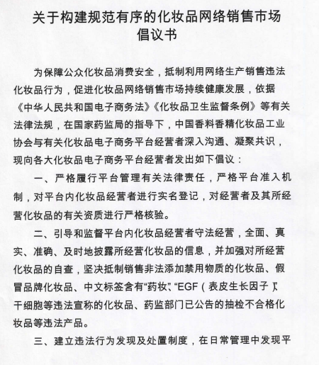 為促進(jìn)化妝品網(wǎng)絡(luò)銷售市場持續(xù)健康發(fā)展,國家藥監(jiān)局化妝品監(jiān)管司充分調(diào)動行業(yè)積極性,指導(dǎo)中國香料香精化妝品工業(yè)協(xié)會發(fā)布《關(guān)于構(gòu)建規(guī)范有序的化妝品網(wǎng)絡(luò)銷售市場倡議書》(以下簡稱《倡議書》)。《倡議書》于4月17日發(fā)布,隨后阿里巴巴、京東、聚美優(yōu)品、唯品會、網(wǎng)易嚴(yán)選、網(wǎng)易考拉、拼多多、小紅書8家主流化妝品電子商務(wù)平臺相繼簽署承諾書,承諾將嚴(yán)格履行電商平臺管理有關(guān)法律責(zé)任,自覺抵制利用網(wǎng)絡(luò)生產(chǎn)銷售違法化妝品行為。4月30日,國家藥監(jiān)局又在全國范圍內(nèi)部署開展“線上凈網(wǎng)線下清源”專項(xiàng)工作,排查處置化妝品網(wǎng)絡(luò)銷售市場安全風(fēng)險,督促化妝品網(wǎng)絡(luò)銷售者和化妝品電子商務(wù)平臺經(jīng)營者落實(shí)化妝品經(jīng)營者主體責(zé)任。5月伊始,上述8家電子商務(wù)平臺又同步上線化妝品消費(fèi)提示語“國家藥監(jiān)局提示您:請正確認(rèn)識化妝品功效,化妝品不能替代藥品,不能治療皮膚病等疾病”,提醒廣大消費(fèi)者防范化妝品消費(fèi)風(fēng)險。