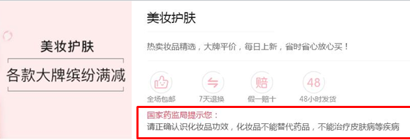 中國食品藥品網(wǎng)訊(記者 陳燕飛) “國家藥監(jiān)局提示您:請正確認(rèn)識化妝品功效,化妝品不能替代藥品,不能治療皮膚病等疾病”,5月23日,記者隨意打開一個化妝品購物網(wǎng)站,這樣的消費(fèi)提示就出現(xiàn)在選購頁面。這是電商平臺主動履行主體責(zé)任的一個縮影。