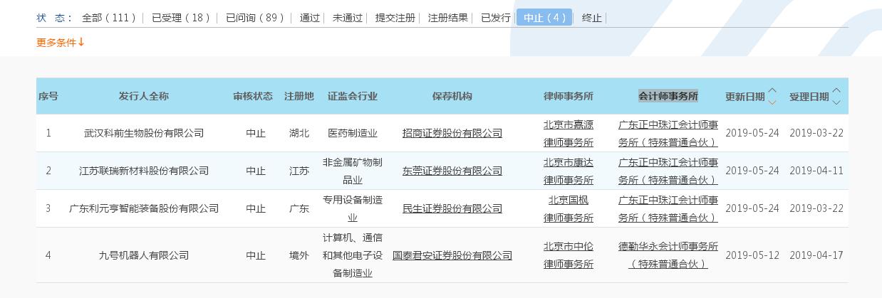 上交所5月24日中止審核的三家企業,會計師事務所均為正中珠江會計師事務所。