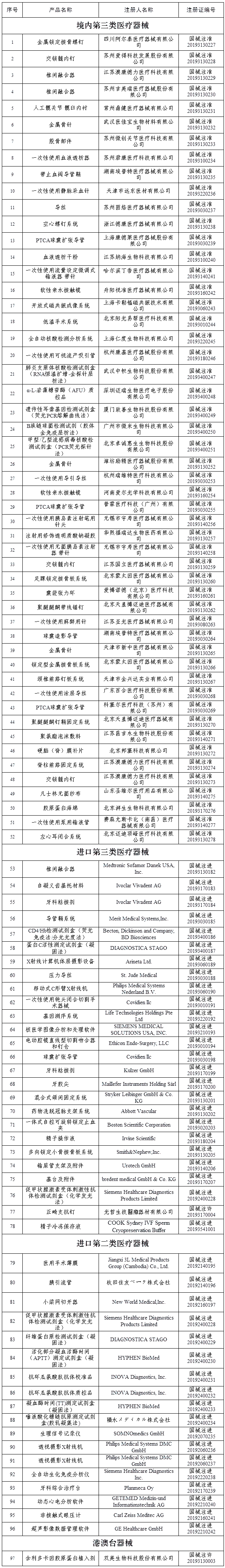 2019年4月,國家藥品監督管理局共批準注冊醫療器械產品97個。其中,境內第三類醫療器械產品52個,進口第三類醫療器械產品26個,進口第二類醫療器械產品18個,港澳臺1個(具體產品見附件)。