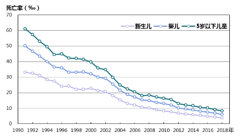 新生兒死亡率、嬰兒死亡率和5歲以下兒童死亡率分別從1991年的33.1‰、50.2‰和61.0‰,下降至2018年的3.9‰、6.1‰和8.4‰,分別下降了88.2%、87.8%和86.2%(圖4)。